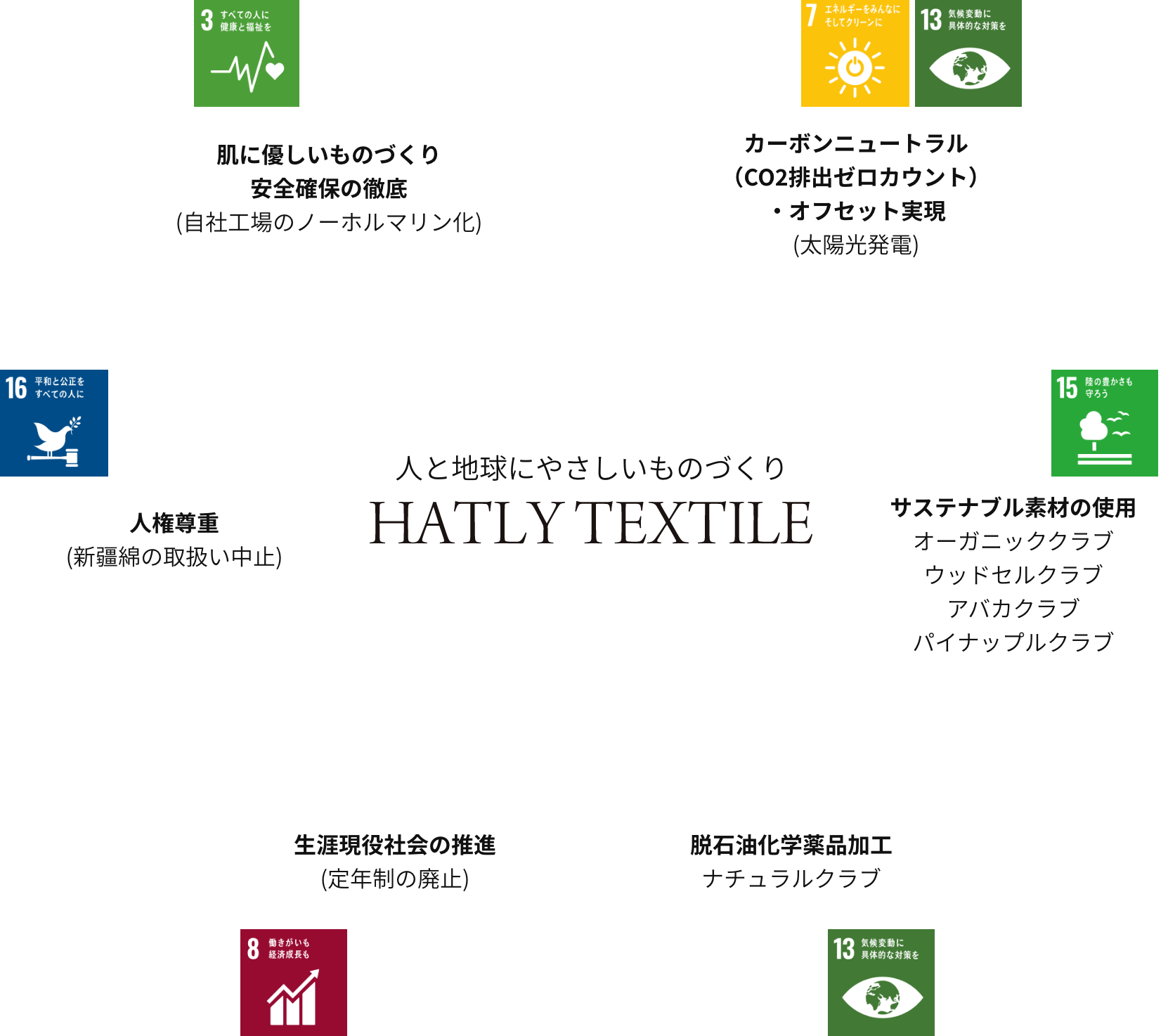 「人に優しい安全なものづくり」を経営理念とし、自社の全ての工場においてホルムアルデヒド系樹脂の加工剤を排除し、乳幼児でも安心して使用できる安全なものづくりを進めてきました。